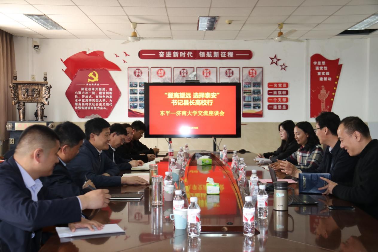 的人才培养、学科建设、科学研究、社会服务等方面情况,回顾了学校近年来与东平开展的人才交流和校地合作情况,他表示,学校与东平地缘相近、人缘相亲,合作前景广阔,下一步双方将加强交流,在科技、教育和人才等方面深化合作,促进学校和东平共同高质量发展,为黄河流域生态保护和高质量发展示范区建设贡献力量。