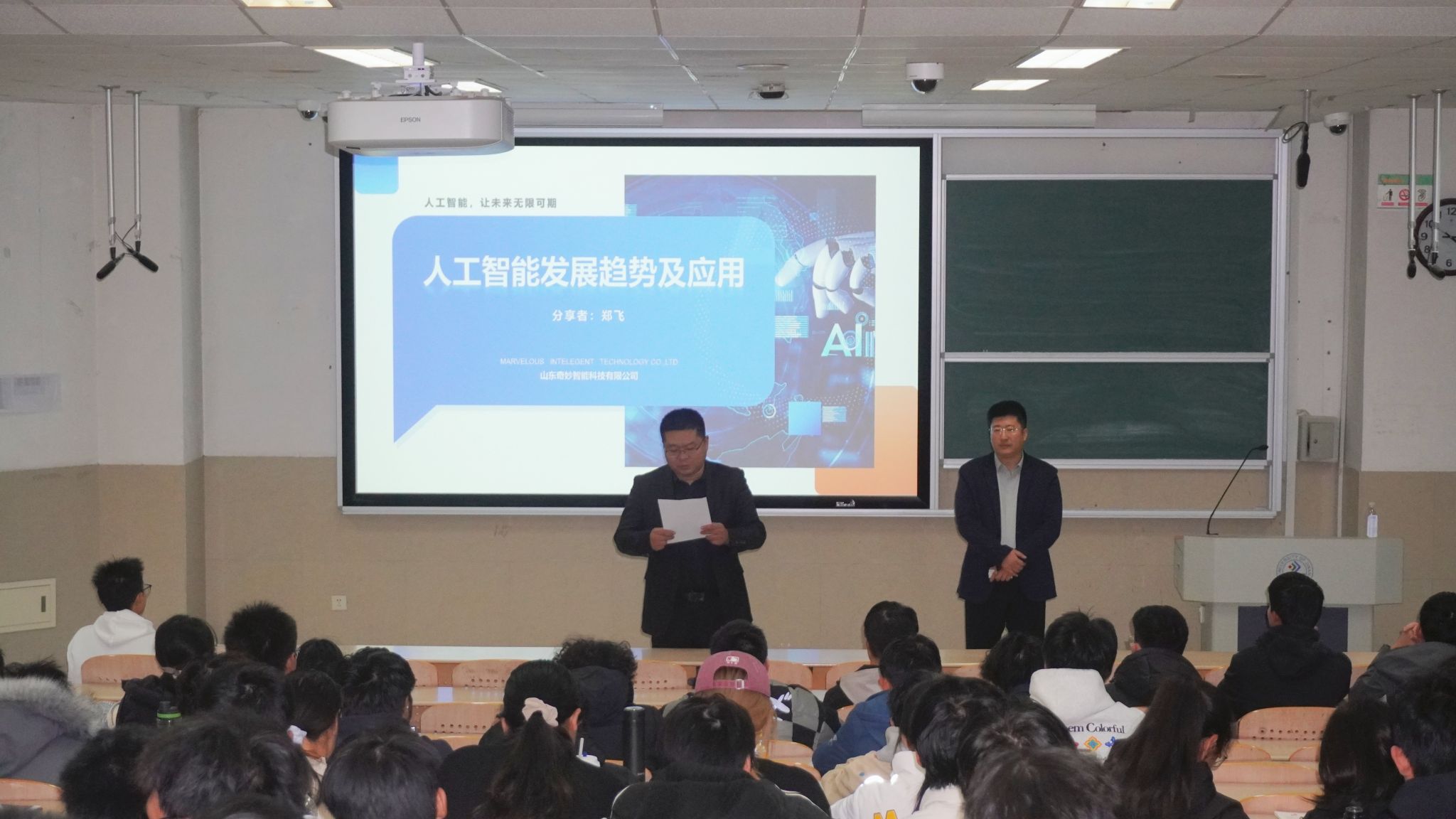 2025级“启航讲堂”第三讲在第十一教学楼顺利举行。圣泉集团、山东奇妙智能科技有限公司董事长郑飞受邀作为主讲嘉宾,为新生带来题为《人工智能发展趋势及应用》的专题报告。报告会由院长助理李猛主持。