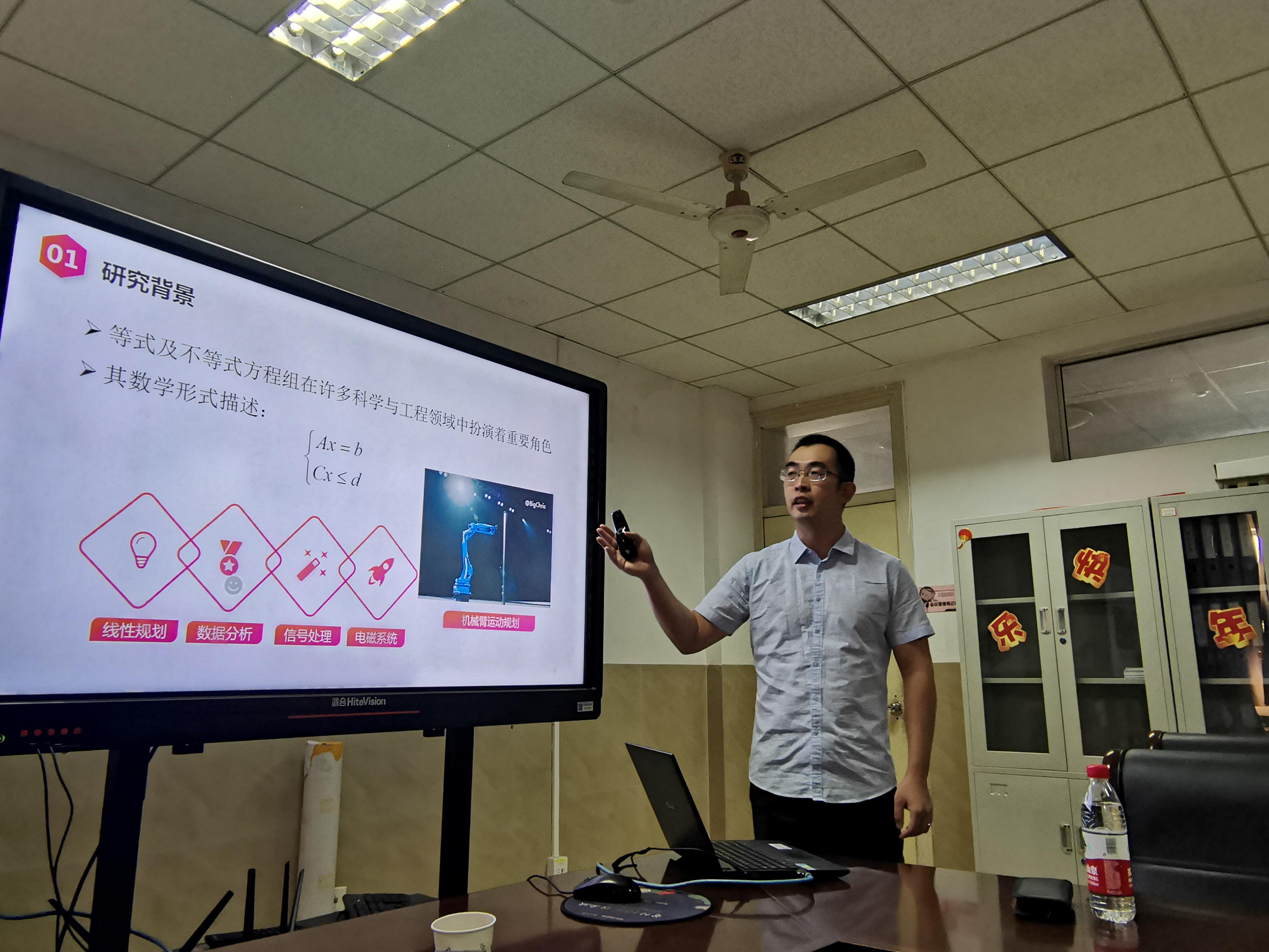 郭东生博士做了“求解时变等式及不等式方程组的递归神经网络”的专题报告,针对时变情况下求解等式及不等式方程组的研究与应用较少的背景,郭博士详细介绍了其课题组近期研究应用一种新型递归神经网络来求解时变等式及不等式方程组的理论分析和仿真测试的成果,通过把神经网络及其离散模型应用于机械臂的运动规划中测试证明了其有效性。郭博士的报告引起了与会人员的极大兴趣,纷纷结合自己的研究方向、就关注的热点理论与技术问题与郭博士进行了互动交流。