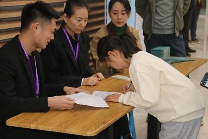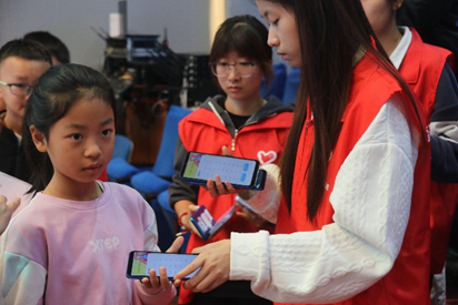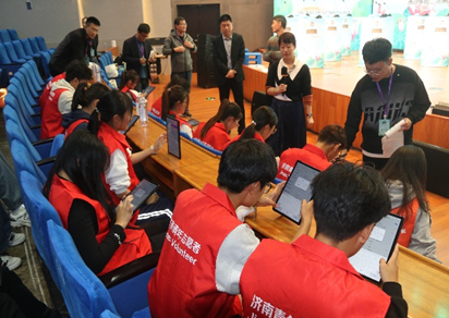 在活动的准备阶段,青年志愿者们帮助活动负责人接待参赛选手,为每位参赛选手分配答题手机,并引导他们坐在相应的位置。