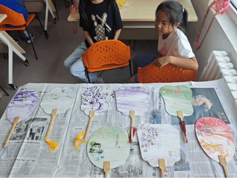 在制作环节,志愿者演示了“旋转浸漆”技法——将漆料倒入桶中,把扇子旋转着慢慢浸入再快速抽出,扇面便均匀附上了绚丽漆色。同学们在指导下细心操作,亲手完成漆扇制作后,还纷纷在扇面上题字、书写古诗,赋予作品独特个性。看着自己的成果,孩子们脸上洋溢着喜悦,深刻感受着传统文化的魅力。