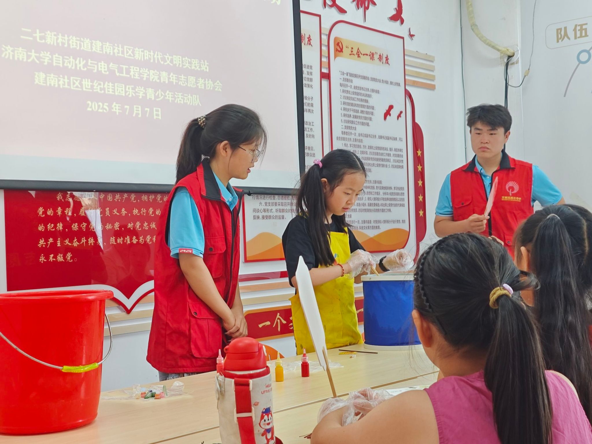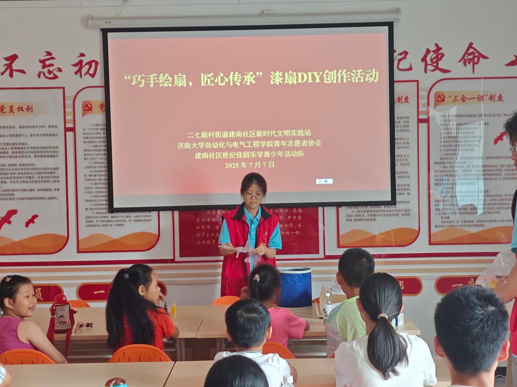 青年志愿者协会联合二七新村街道建南社区新时代文明实践站、建南社区世纪佳园乐学青少年活动队,共同开展了“巧手绘扇,匠心传承”漆扇DIY暑期三下乡社会实践活动,为社区的同学们带来了一场兼具知识性与趣味性的文化体验。