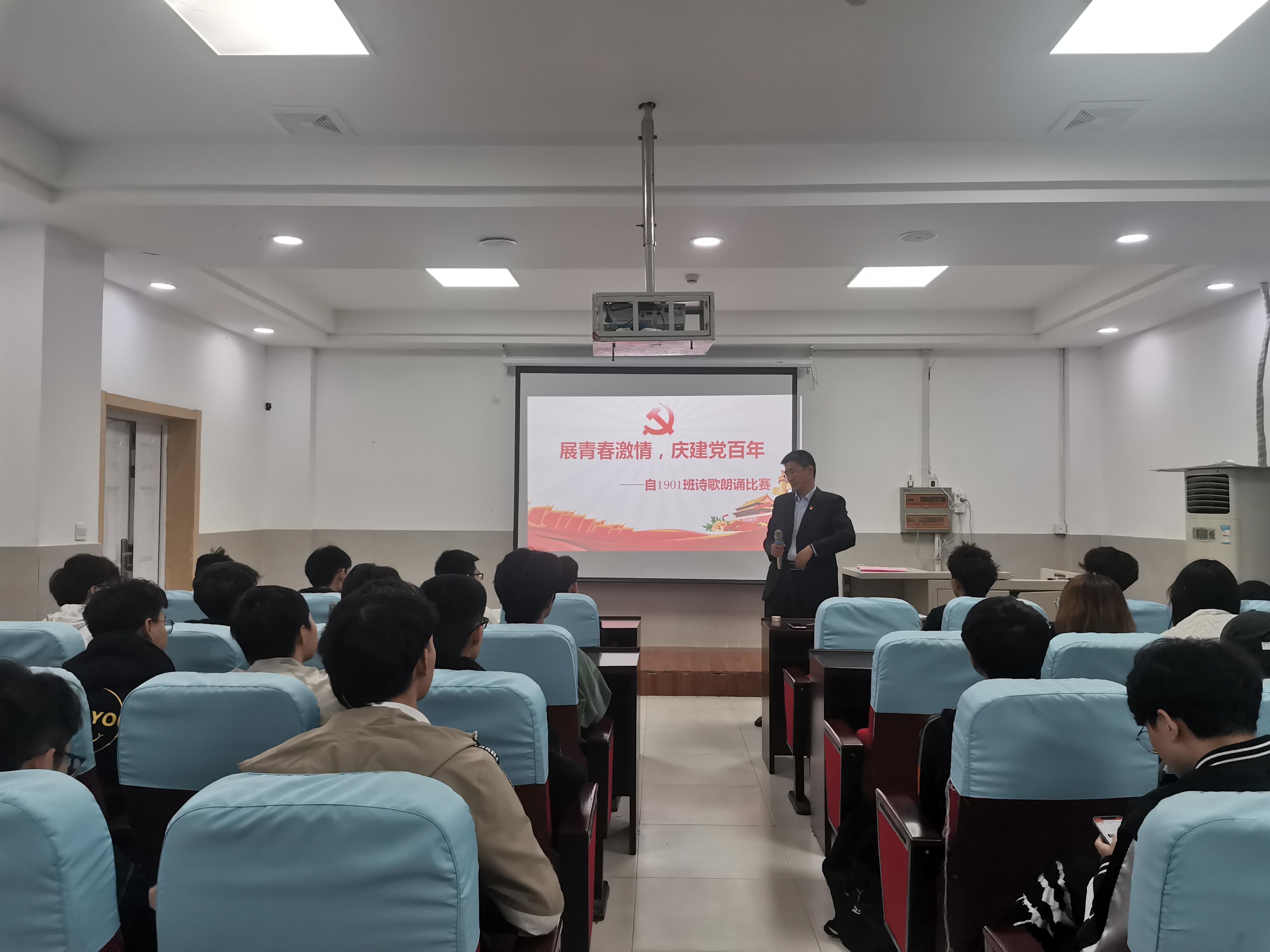 期间,班主任、学院党委书记夏卫东老师结合建党百年,与大家交流了党史学习教育的感悟和认识,激励同学们要进一步树立为国为党立志成长成才的人生理想。随后夏卫东老师声情并茂,铿锵有力地现场为大家朗诵了党的第一代领导核心毛泽东主席的两首诗词,使全场的气氛瞬间热烈起来,赢得大家阵阵掌声。
