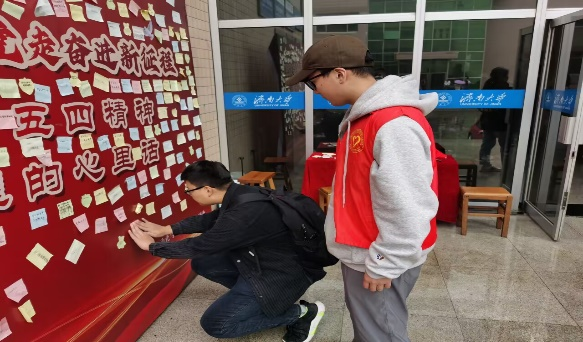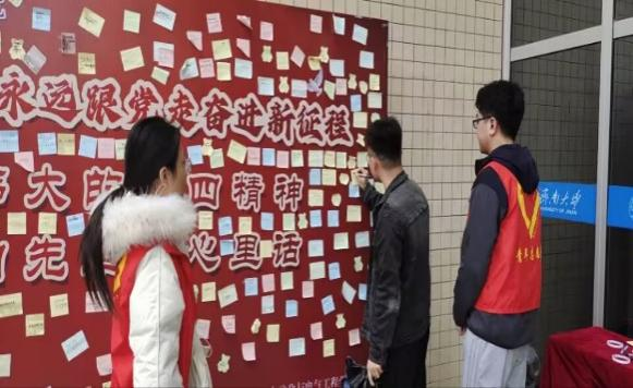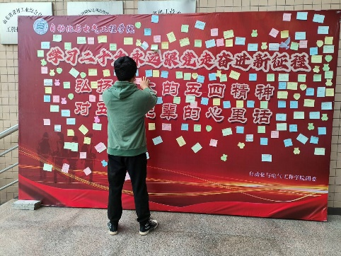 团委、研究生联合会在第一教学楼门口布置了“学习二十大、永远跟党走、奋进新征程,弘扬伟大的五四精神,对五四先辈的心里话”展板,研究生联合会在现场负责引导师生积极参与活动并维持现场秩序,各团支部积极主动配合,组织师生开展主题团日活动。现场聚集大量前来参加“学习二十大、永远跟党走、奋进新征程,弘扬伟大的五四精神,对五四先辈的心里话”活动的有志青年,他们怀着崇高的敬意,在便利贴上写下了对党的祝福和对伟大五四先辈们的缅怀及崇敬之意。一字一语,都表达了同学们深刻学习宣传贯彻党的二十大精神的决心,坚定不移跟党走的信念以及对伟大五四精神的弘扬和对五四先辈的崇敬之情。